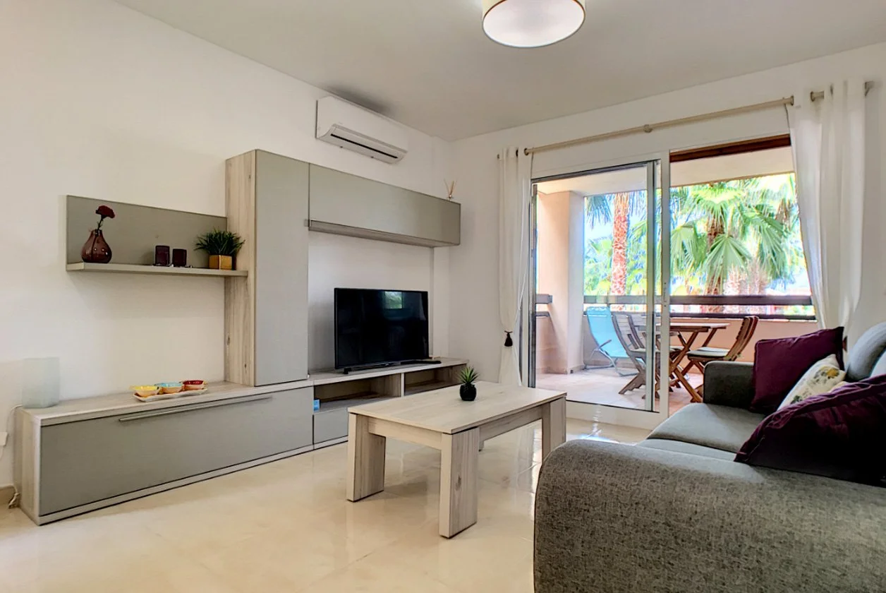 This apartment is located on the ground floor in the popular complex of Ribera Beach in Mar de Cristal. It is a few minutes walking distance to a great beach area and has of 2 bedrooms, bathroom, fully equipped kitchen, lounge/diner and large patio area backing onto a park. Mar de Cristal has a tennis centre, supermarket, sailing school and a selection of bars and restaurants all within walking distance of the apartment.