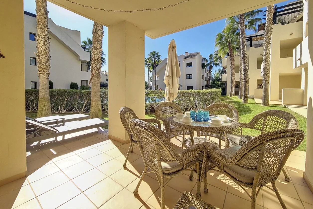 This spacious 1st floor apartment is situated in the popular Roda Golf Resort which is close to San Javier and Los Alcazares. The apartment which has beautiful views over the communal pool and garden area has 2 good sized bedrooms.