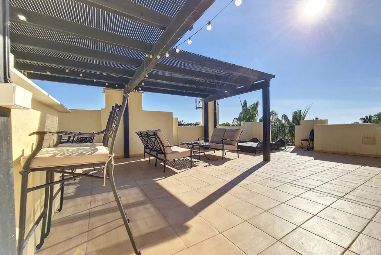 his modern and spacious penthouse apartment is situated on the popular Roda Beach and Golf Resort which is close to San Javier and Los Alcazares. The property has 2 bedrooms, one with en suite bathroom and separate shower room. There is a sofa bed in the lounge therefore accommodating up to 6 guests. It has a well equipped kitchen with modern appliances and there are English and Spanish TV channels. Internet access is also available. A lovely balcony area has spiral steps to the very large and private roof solarium.
