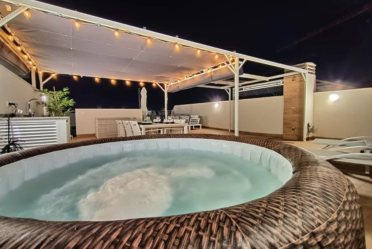 The main living space is open plan and includes a modern kitchen, lounge and dining room. The main bedroom boasts a king-size bed and a large en-suite bathroom with a walk in shower. The second bedroom offers a king-size bed. There is also an additional bathroom with a shower. The apartment features a spacious private roof terrace with Jacuzzi, a kitchen area, chill-out sofas, a dining table, loungers and chairs with a sunshade.