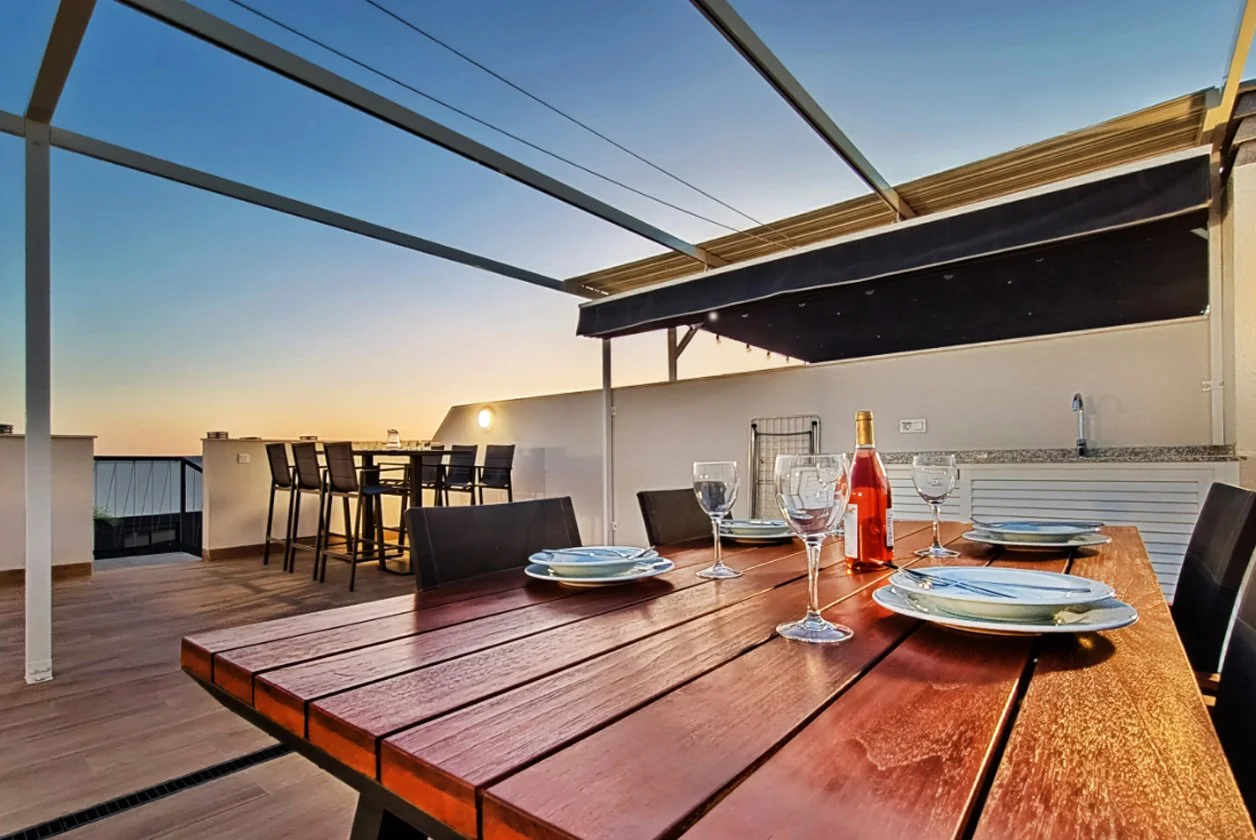 The main living space is open plan and includes a modern kitchen, lounge and dining room. The main bedroom boasts a super king-size bed and a large en-suite bathroom with a walk in shower. The second bedroom offers two single beds. There is also an additional bathroom with a shower. The apartment features a spacious private roof terrace with a kitchen area, chill-out sofas, a dining table, loungers and chairs with a sunshade.