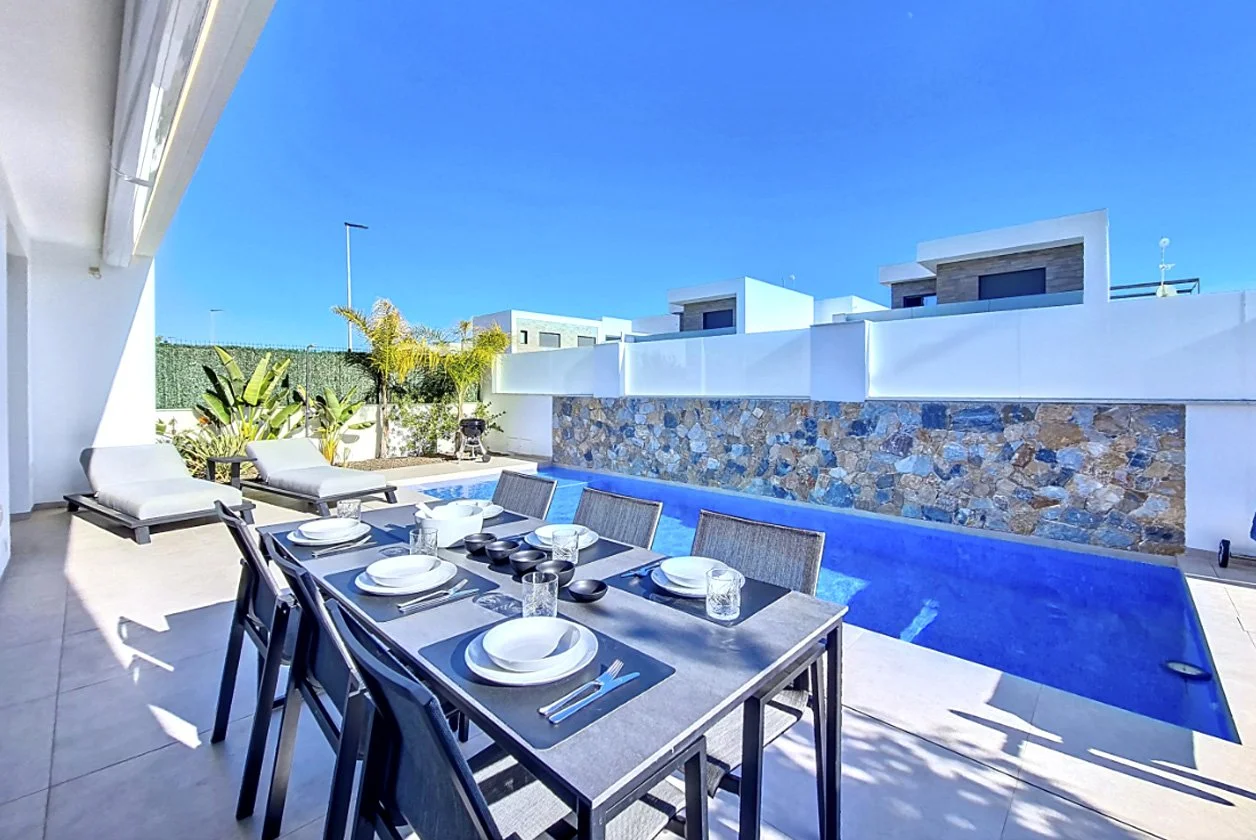 This large, modern villa is the perfect get away for all the family. It is located close to the sandy blue flag beaches on the Mediterranean Sea and the Mar Menor. The villa has 3 bedrooms on two floors, 2 bathrooms and 4 large patio spaces. It has its own private pool, outside dining area with BBQ, and plenty of space to relax and sunbath.