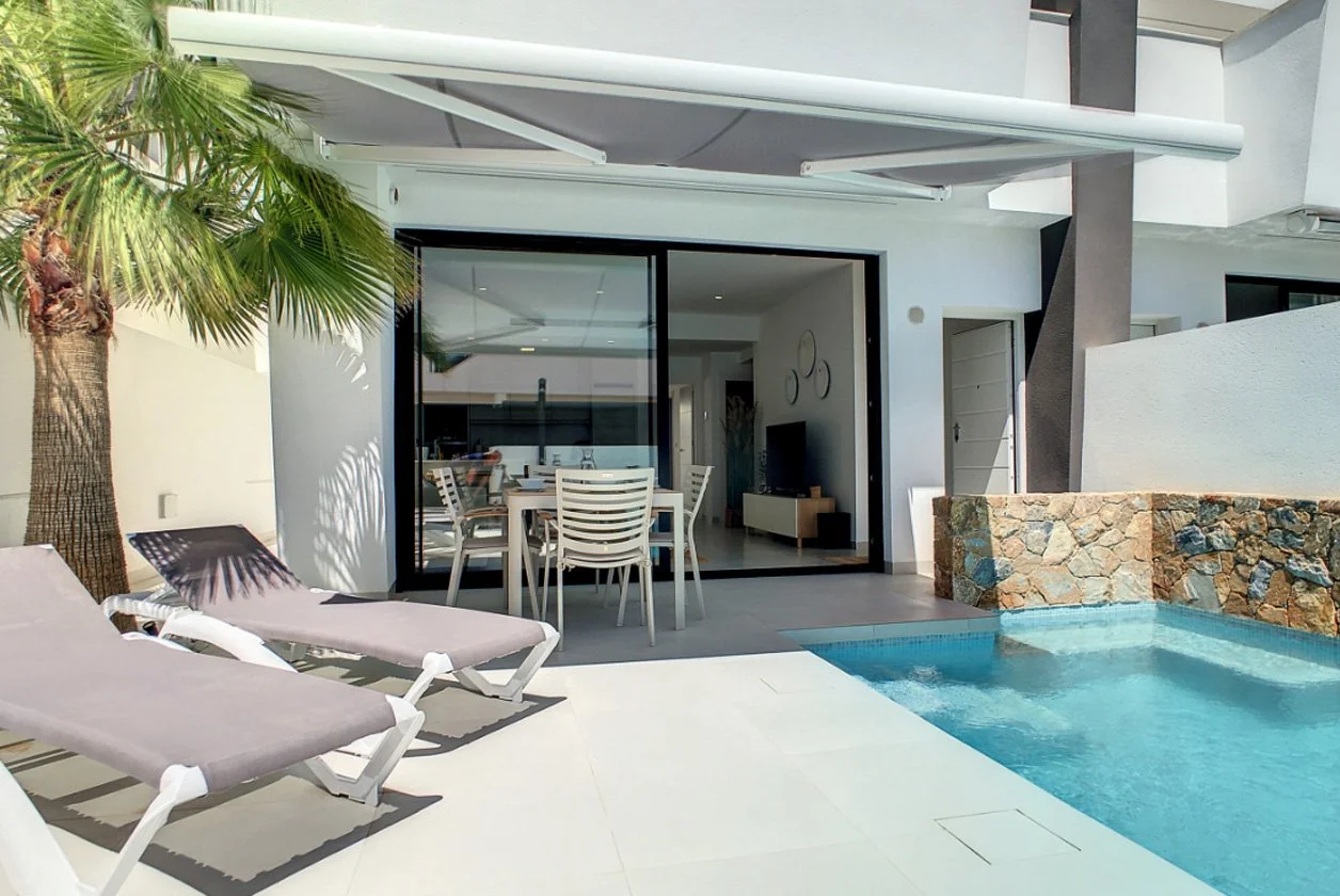 This modern villa with a private pool is located close to the sandy blue flag beaches on the Mediterranean sea and the Mar Menor. The villa has 3 bedrooms on two floors, 2 bathrooms, a fully fitted open-plan kitchen leading onto the dining area and living room. One bedroom is on the ground floor with access to the ground floor bathroom. On the first floor you will find the second bedroom that has large patio doors out onto the front terrace.